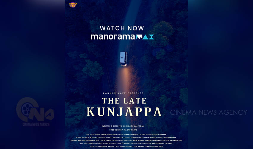 'കണ്ണൂര് കഫേ'യുടെ ബാനറില് ഷിജിത്ത് കല്യാടന് രചനയും സംവിധാനവും നിര്വ്വഹിക്കുന്ന 'ദി ലേറ്റ് കുഞ്ഞപ്പ' എന്ന ചിത്രം മനോരമ മാക്സില് റിലീസായി.
